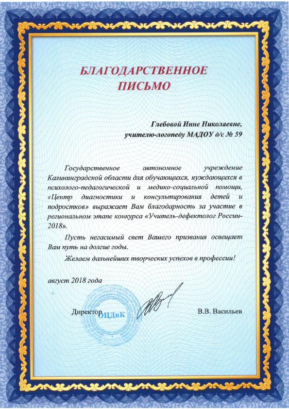 Благодарственные письма за участие в региональном этапе конкурса «Учитель-дефектолог России-2018»