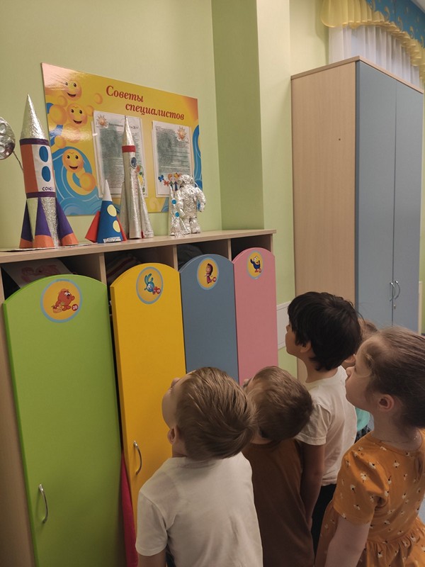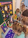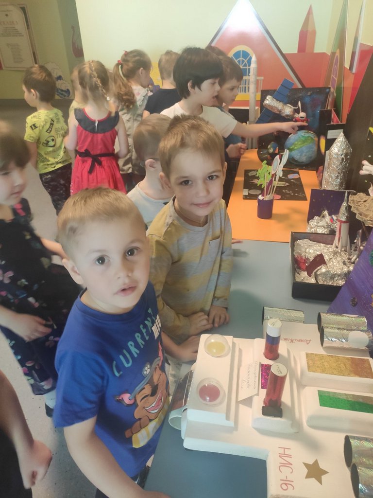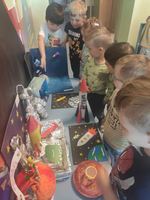 Ребята группы «Янтарики» посетили выставку экспонатов "Отправляемся в космос", размещенную на втором корпусе детского сада.