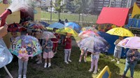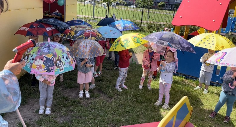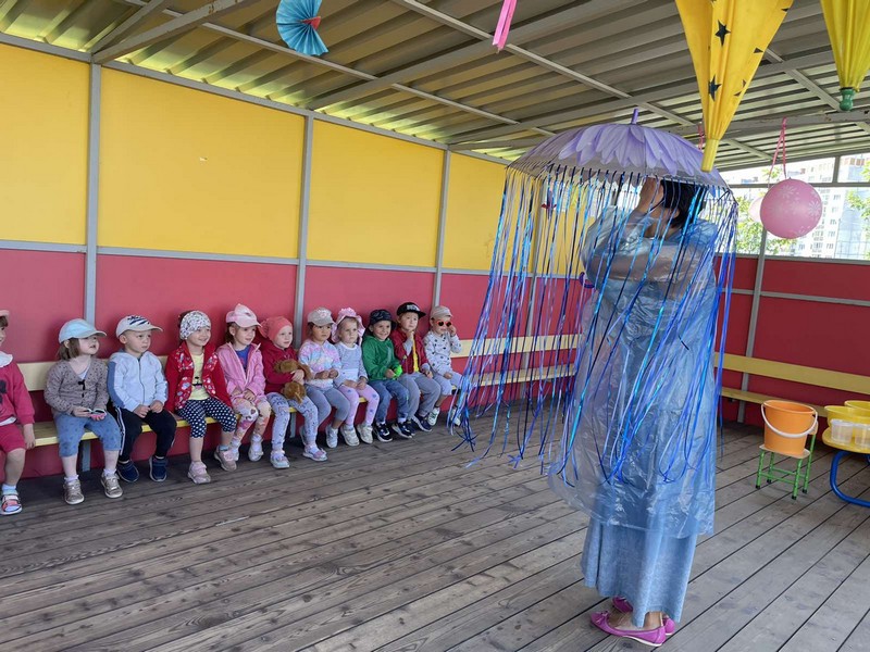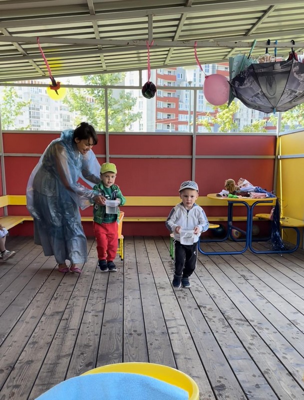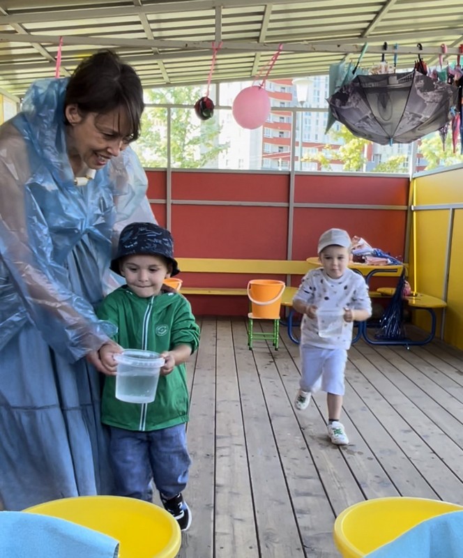 Дети познакомились со сказочным героем «Дождик»; получили представление о воде, её особенностях, свойствах и пользе; участвовали в развивающих, подвижных играх и конкурсах с применением воды и различного реквизита: тазики, миски, ведёрки, полотенца, зонтики…