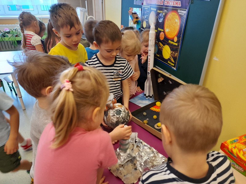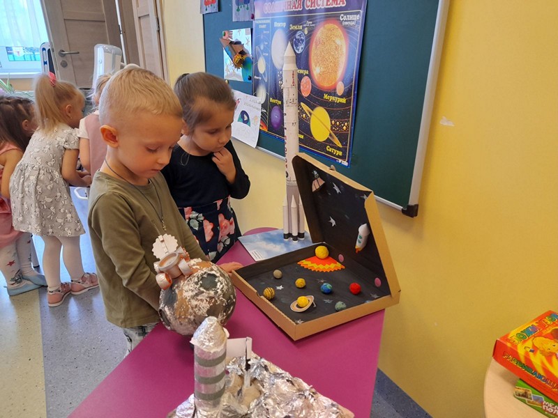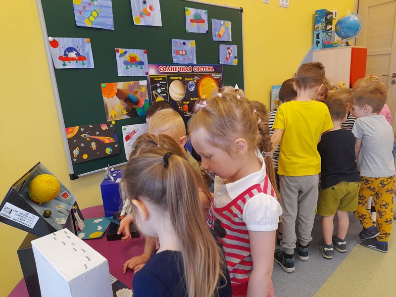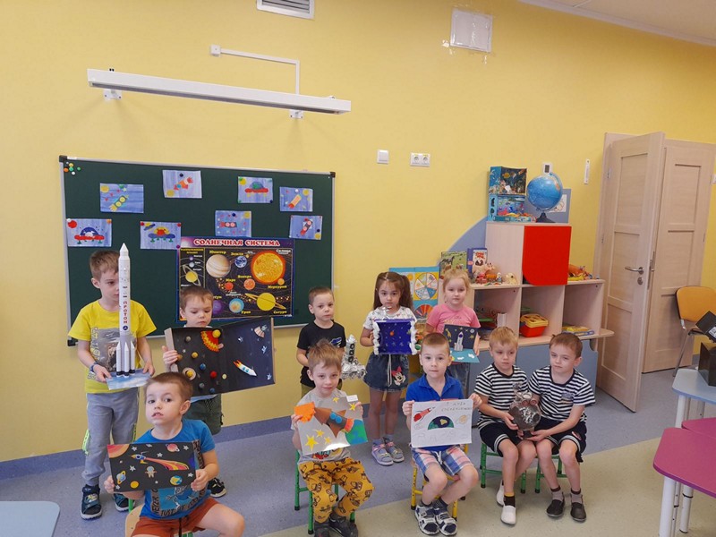Всю первую неделю апреля воспитанники группы «Солнышко» посвятили изучению космоса, солнечной системы. Узнали как и кем покорялся космос. На занятиях расшили представления о космосе, закрепили знания о том, что они живут на планете Земля. Познакомились детей с профессией космонавта. Была проведена совместная работа детей с родителями. Сегодня каждый ребёнок представил свою работу, рассказал кто ему помогал, из чего сделана подделка и что изображено. Дети были в восторге от выставки.