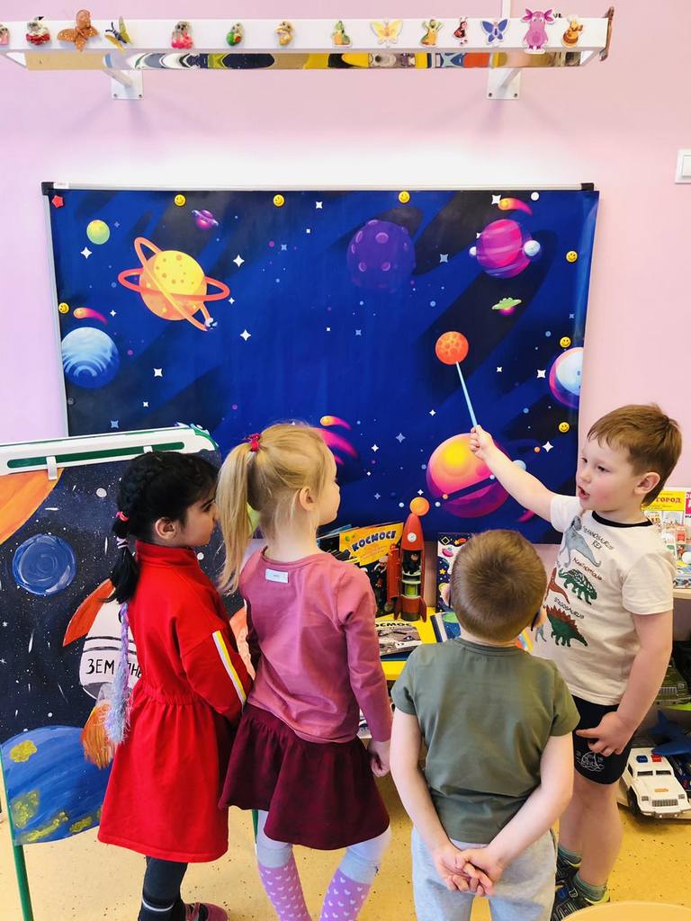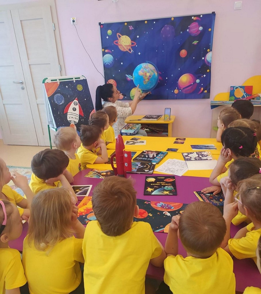 В ходе занятия дети узнали, о том, что планеты в космосе расположены в определенной последовательности и образуют Солнечную систему; каждая планета имеет свои особенности; помимо планет в космосе существуют "небесные тела". Тематическое занятие было проведено с набором обучающих карточек через приложение Smarty 4d.