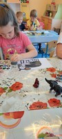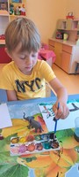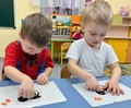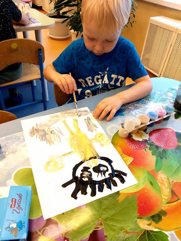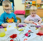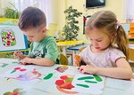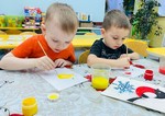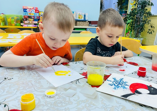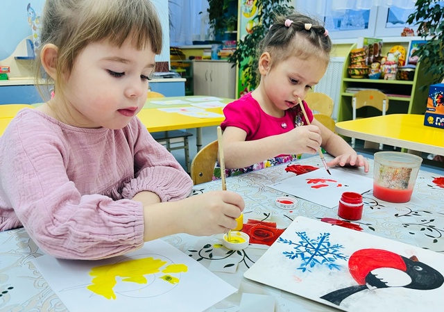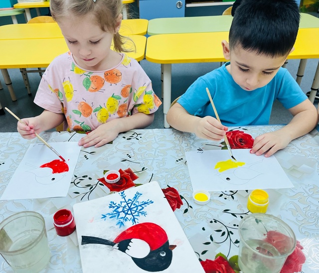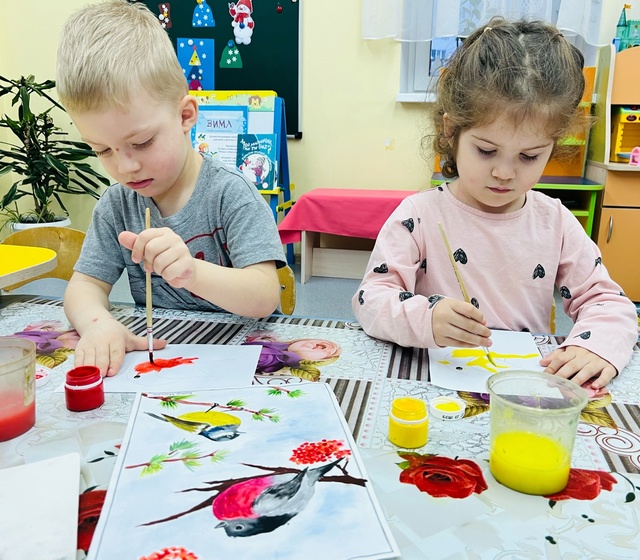 На занятии по художественно-эстетическому развитию (Рисование), дети второй младшей группы «Фантазёры» у воспитателя Сулименко А. И. выполнили раскрашивание гуашью птиц: синицы и снегиря. При раскрашивании дети продолжили учиться правильно держать кисть в одной руке, а другой рукой придерживать лист бумаги. В ходе проведенного занятия не только развивается навык правильно держать кисть пальчиками, но и желание детей раскрасить грудку птицы - жёлтым или красным цветами. Развивается фантазия и воображение при выборе, на какой ветке - еловой или на ветке рябины будет сидеть птица, что так же очень важно для детского творчества.