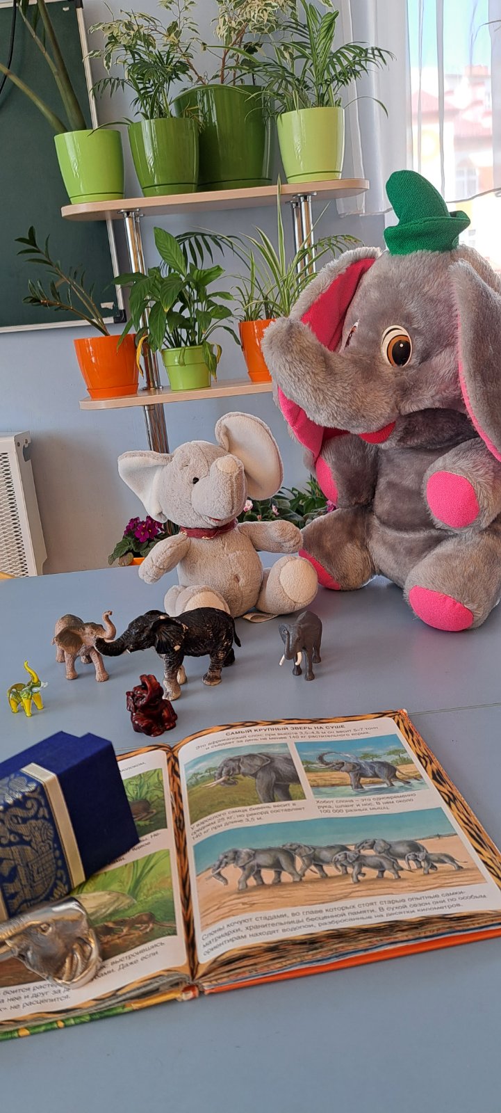 Мы с ребятами познакомились с интересными фактами о слонах, узнали особенности их жизни и поведения. Дети сделали рисунки животных акварелью, раскрасили раскраски и восковыми мелками, принесли из дома разных слонов и слоников.