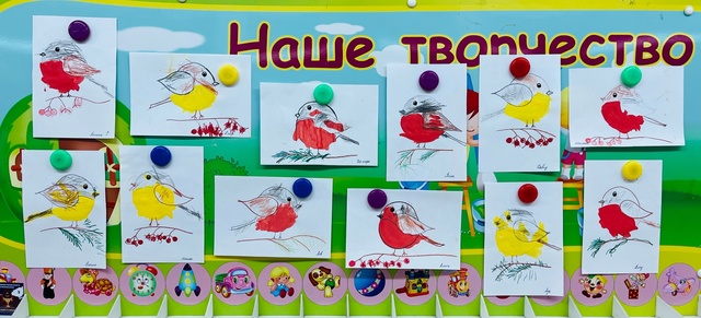 По окончании работы воспитатель и дети рассмотрели, какие красивые желтогрудые синички и красногрудые снегири получились у ребят!