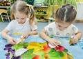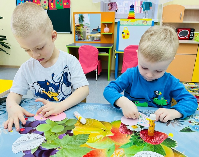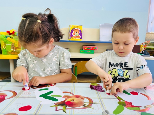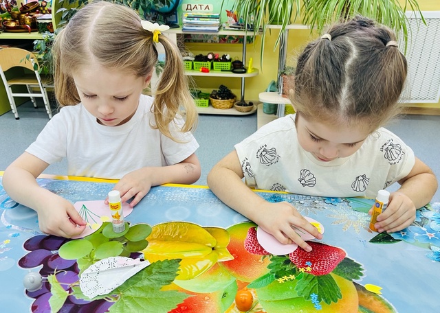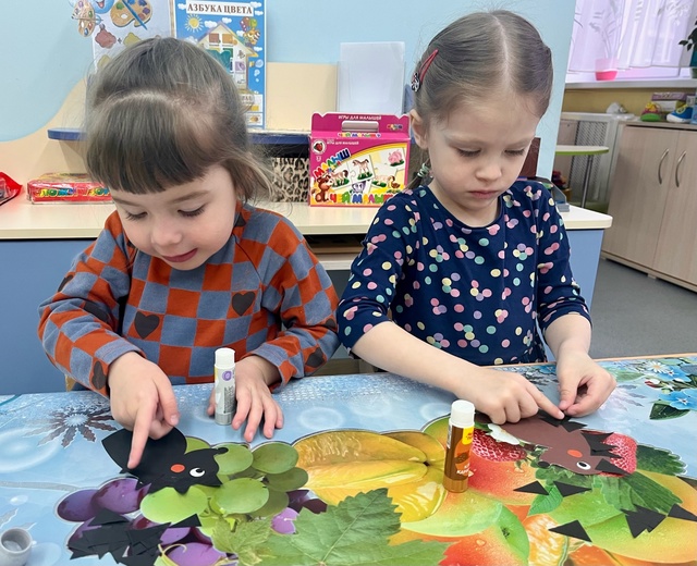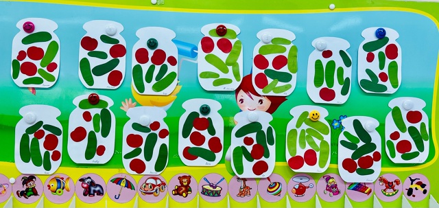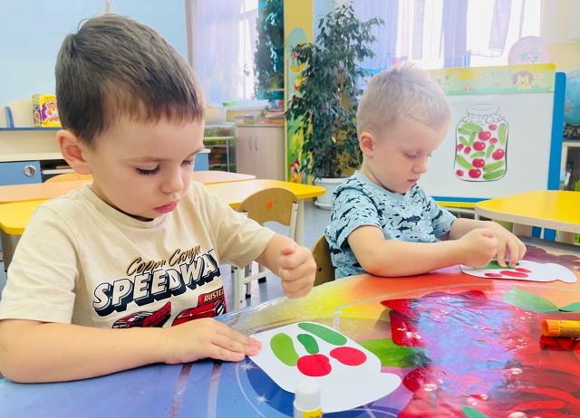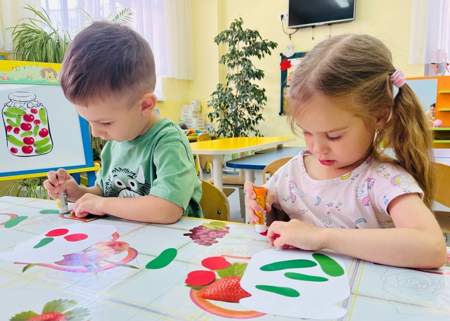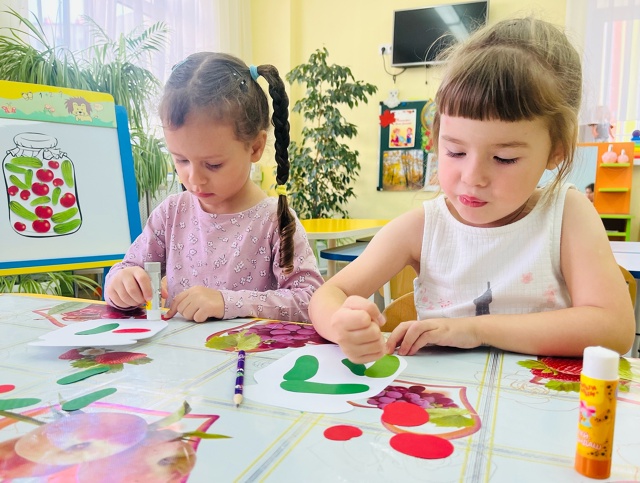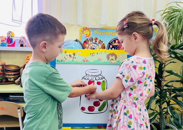 На занятии по художественно-эстетическому развитию средней группы «Фантазеры» у воспитателя Сулименко А. И. в рамках календарной недели «Дары осени» дети расширили представление об овощах: выполнив аппликацию в виде консервирования в банке помидоров и огурцов. А также закрепили умение сравнивать два предмета по величине, обозначая результаты сравнения словами: большой и маленький.