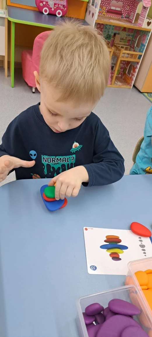 Ребятам группы "Фантазёры" впервые довелось познакомиться с очень интересным игровым пособием. "Радужные камешки" - это тактильный развивающий материал который способствует развитию мелкой моторики; учит работать по заданному образцу; формирует навыки сортировки по признаку; развивает воображение и творчество, усидчивость.