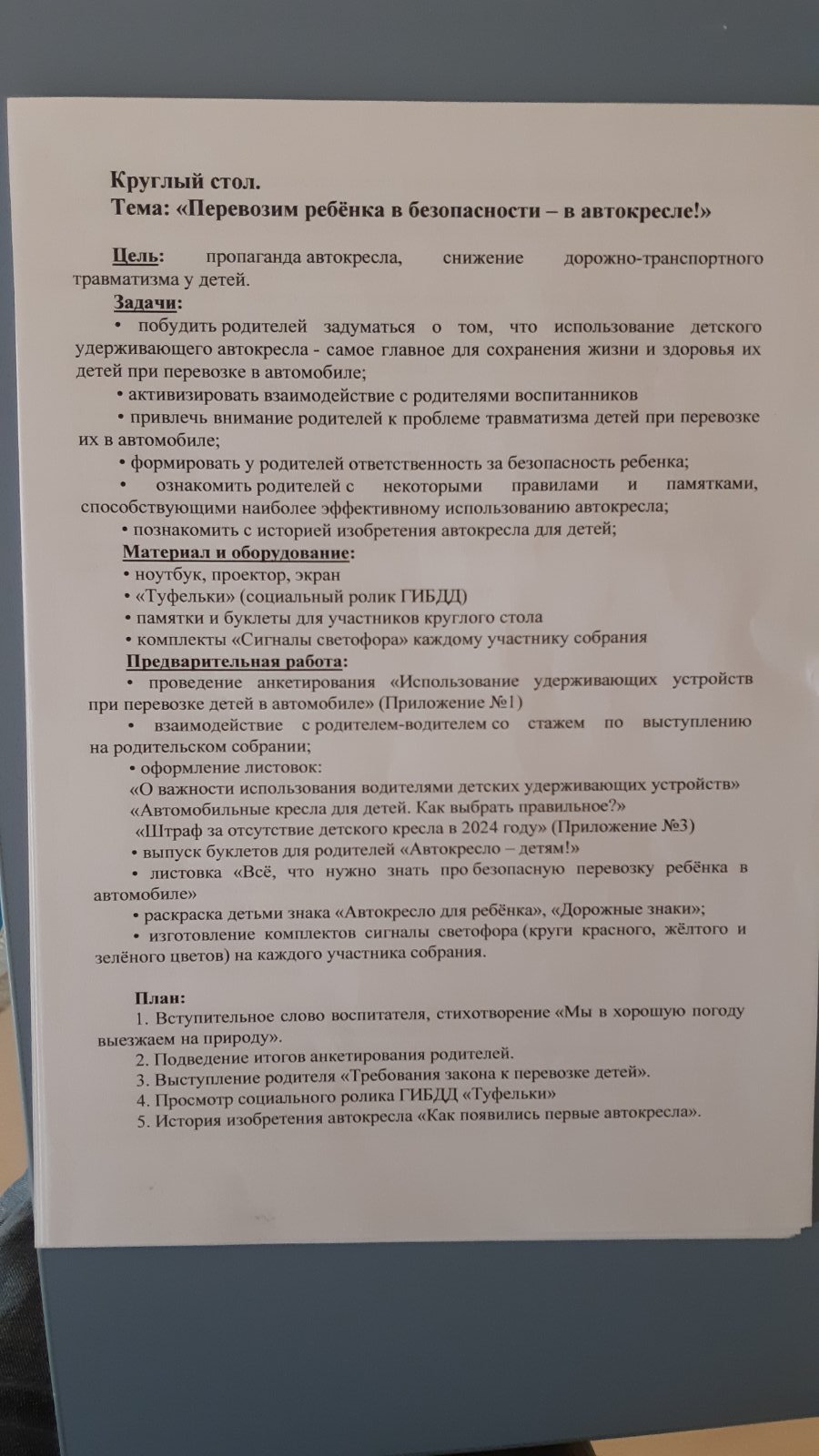 Подготовка и проведение круглого стола с детьми и родителями группы "Гномики" на тему : "Перевозим ребёнка безопасности - в автокресле". 03.04.2024г
