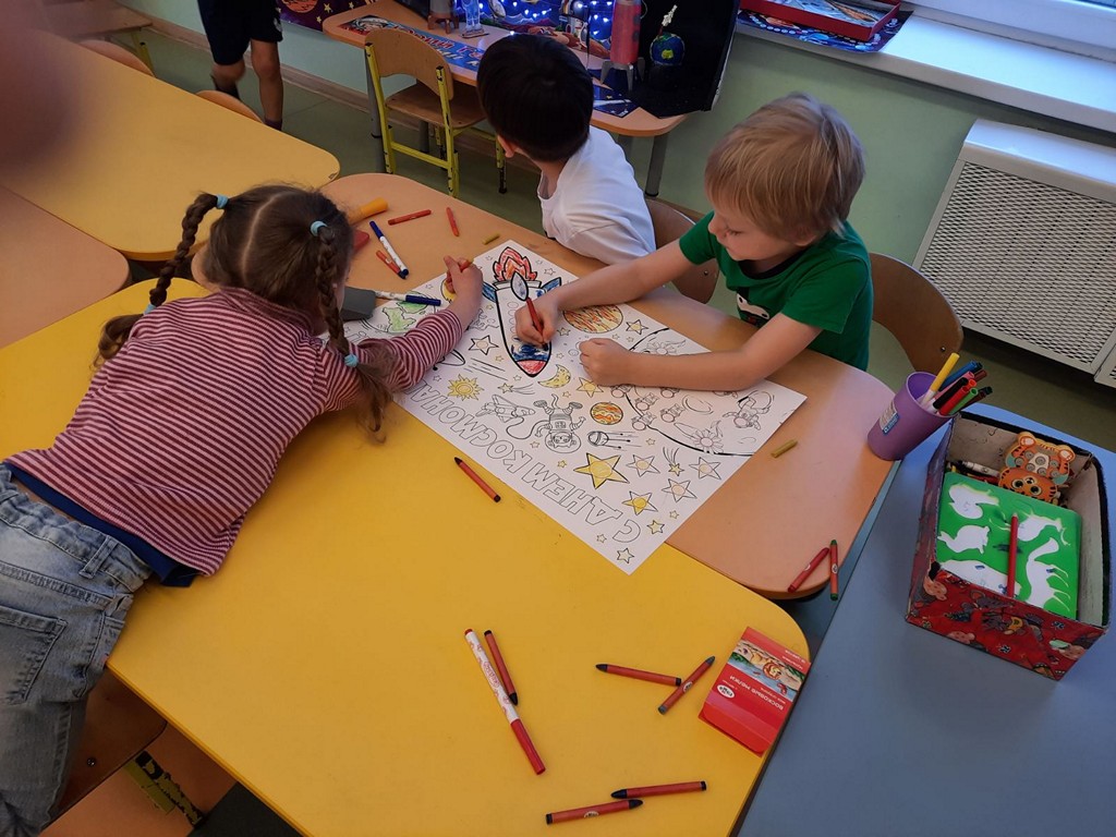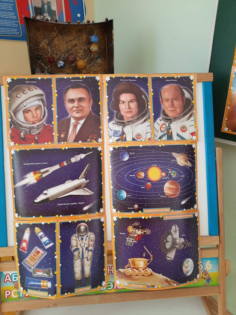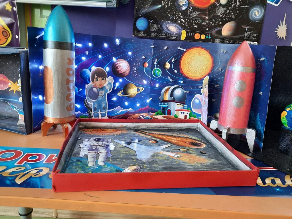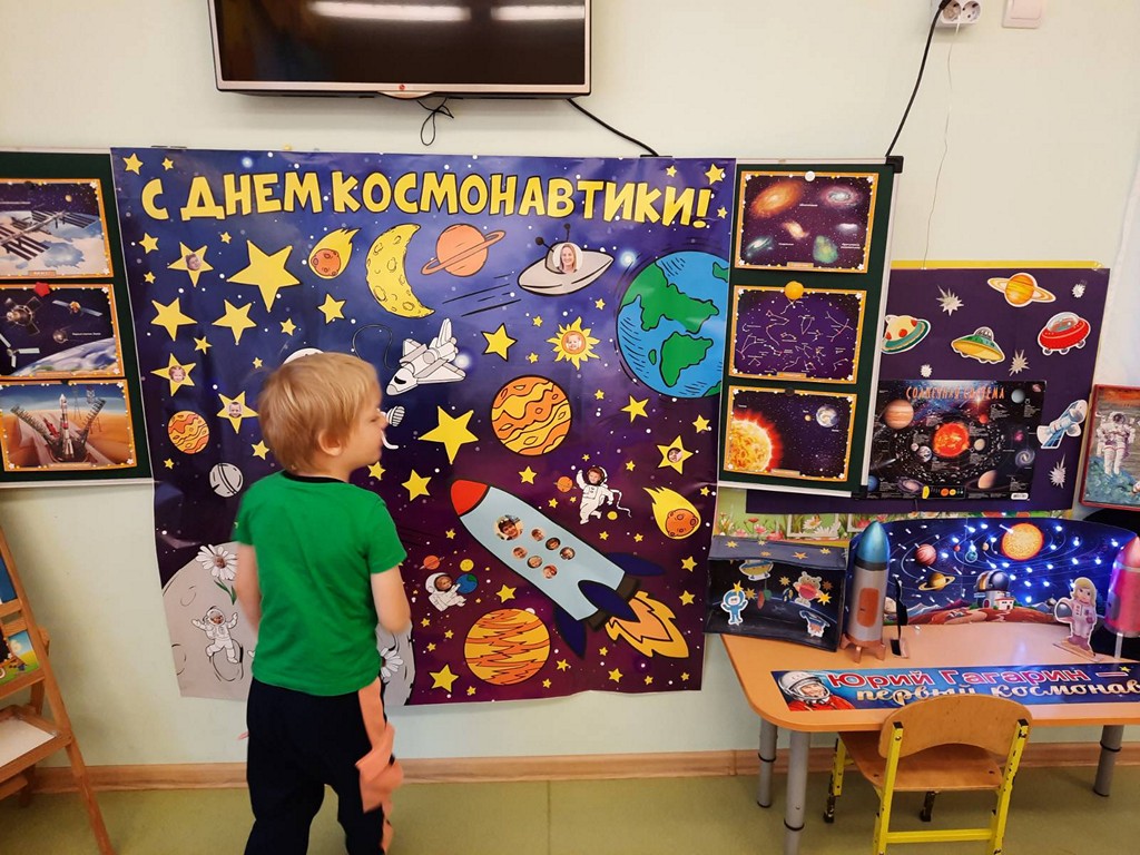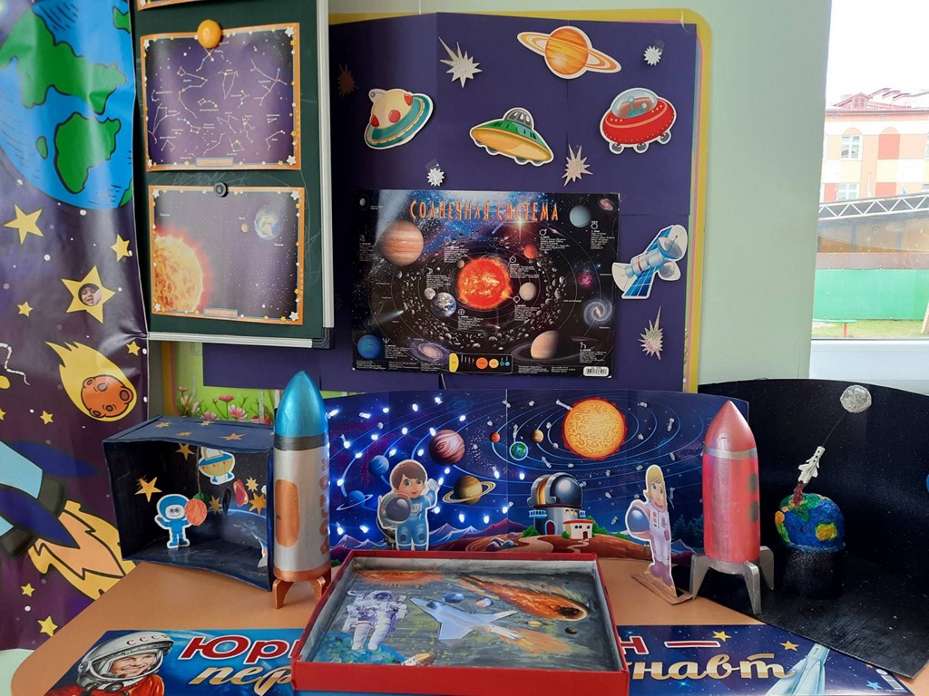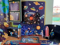 В группе "Лучики" воспитателем Харьковой Юлией Сергеевной и совместной работой воспитанников и родителей, была организована познавательная выставка "Космос и планеты". Здесь ребята изучают солнечную систему, название планет и много интересного и познавательного о космосе. Были организованы ряд мероприятий, посвященных космосу: космические гимнастики, тематические загадки и подвижные игры, беседы «Солнечная система», рассматривание наглядного материала о космосе и первом космонавте земли, организована выставка о космосе для детей и просмотр презентаций и видеосюжетов.
