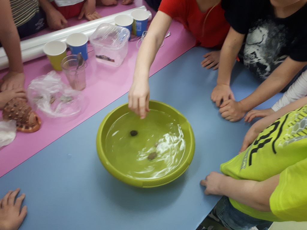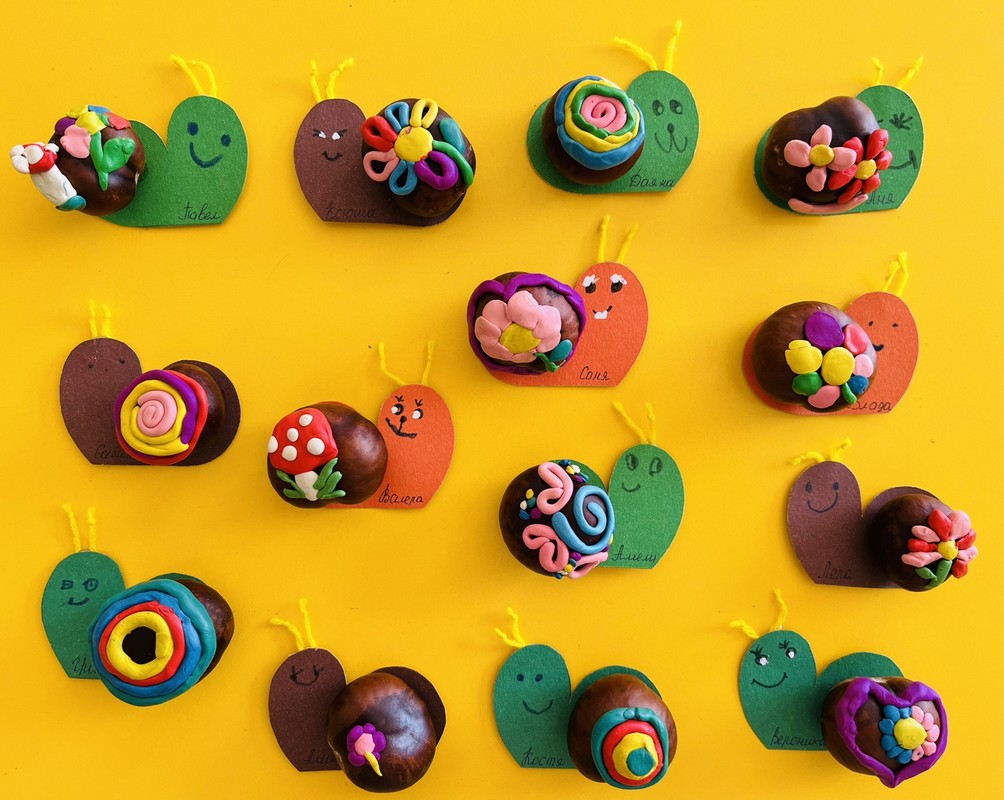 Используя в детском творчестве природные материалы можно выполнять интересные поделки, которые развивают у детей воображение и фантазию. В подготовительной к школе группе «Золотой ключик» на занятии у воспитателя Сулименко А. И. по художественно-эстетическому развитию ребята используя природный материал - каштан, выполнили улитку. Каштан для раковины улитки дети украсили художественными элементами вылепленными из пластилина.