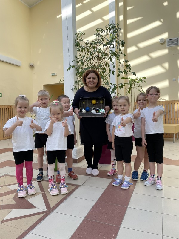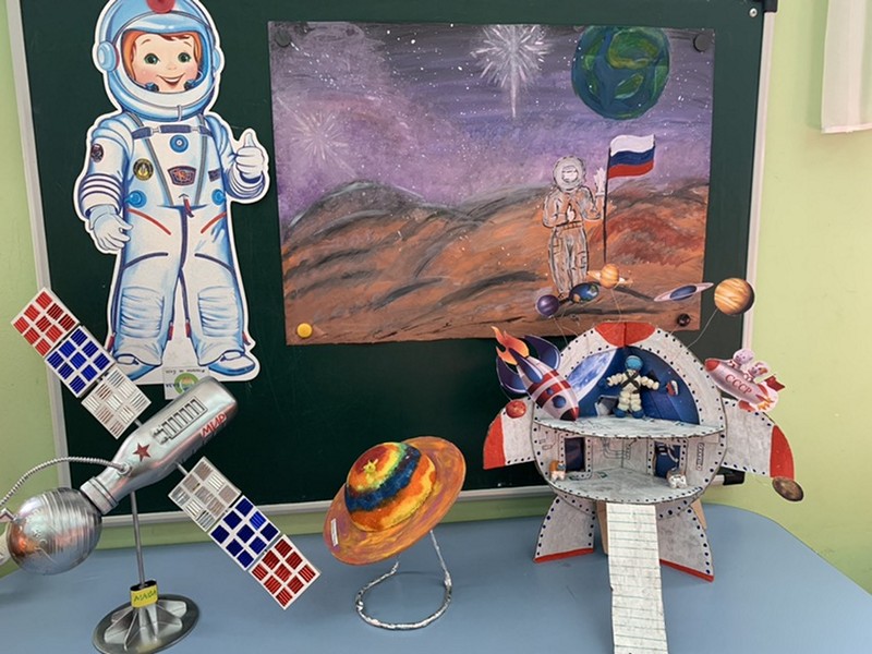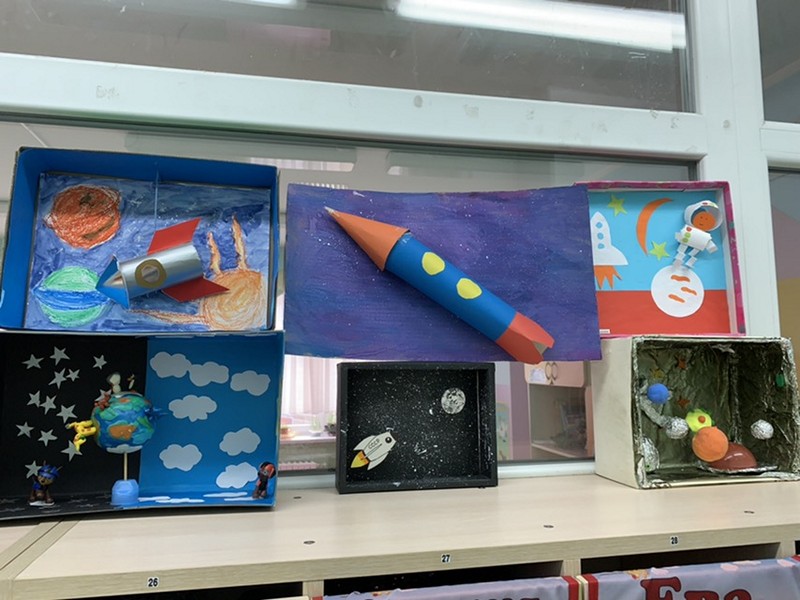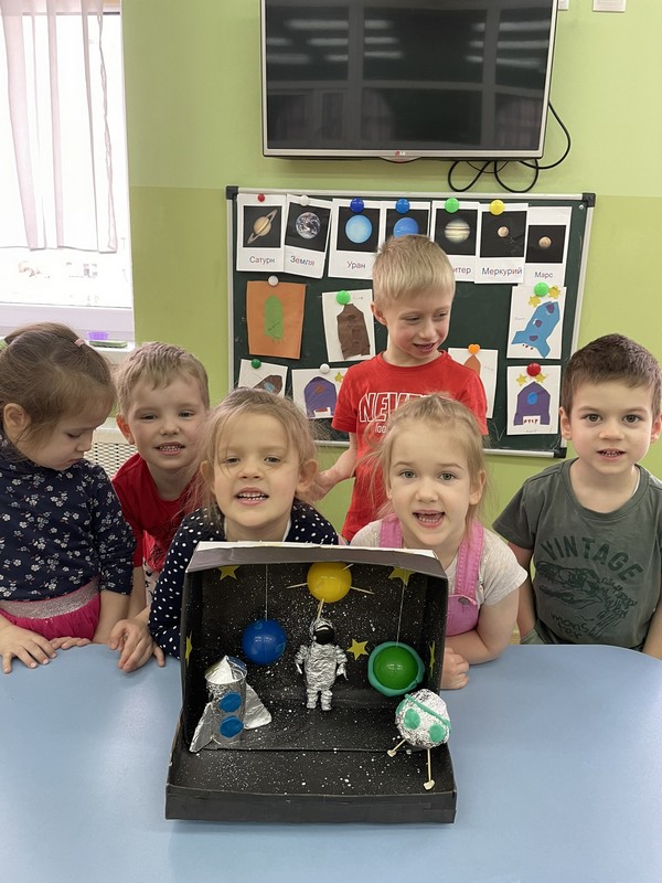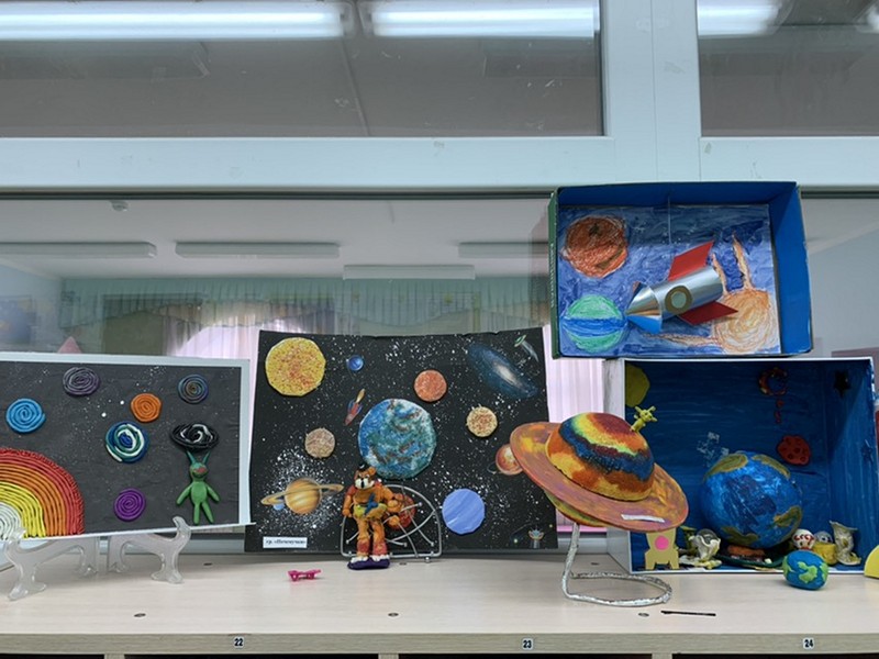 Совместное творчество детей и родителей подготовительной группы «Почемучки» - Житковой Валерии, Прокопенко Марии и Расторгуева Льва. Изготовлены из подручных материалов: пластиковой бутылки, пенопласта, картона. Цель: дать детям представление о космосе и космонавтах, о планетах Солнечной системы и космических кораблях. Космическая станция, планета Сатурн и космический корабль «Мир»