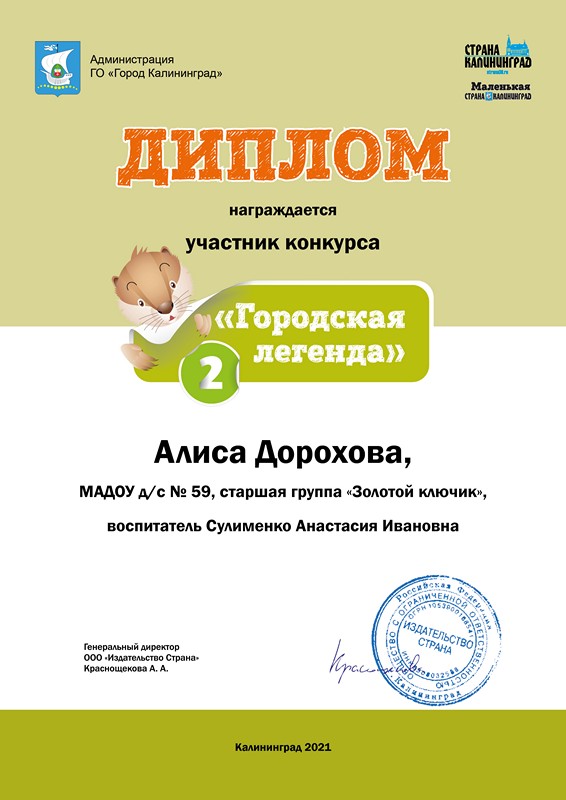 Как авторы своих творческих идей воспитанницы МАДОУ детского сада № 59 совместно с воспитателем Сулименко А. И. получили Дипломы участников конкурса «Городская легенда - 2». Поздравляем!