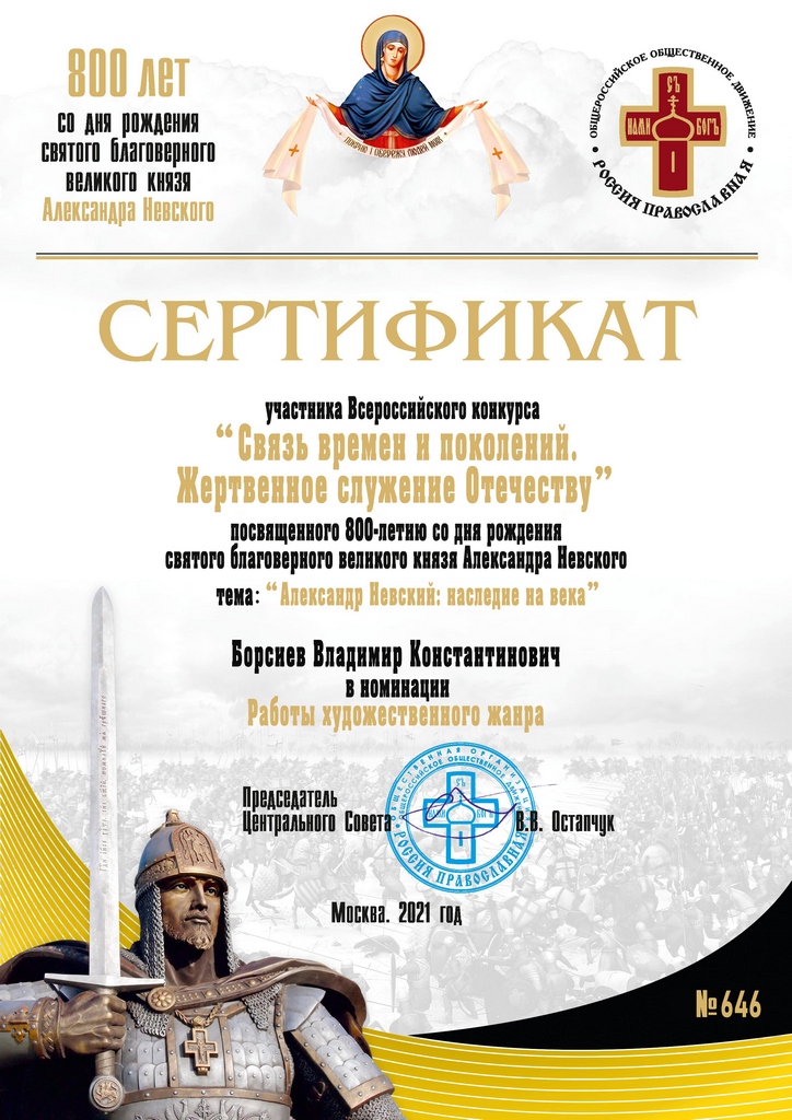 Наш детский сад представлял на конкурсе воспитанник подготовительной к школе группы «Золотой ключик» Борсиев Владимир (воспитатель – Сулименко Анастасия Ивановна). На конкурс представлен рисунок «Русский князь – Александр Невский» вноминации «Работы художественного жанра»в возрастной категории до 7 лет.