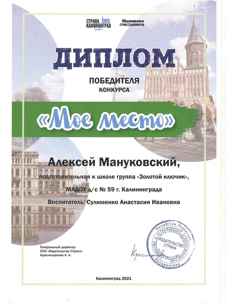 В конкурсе «Моё место», приуроченном к 75-летию Калининградской области принял участие воспитанник подготовительной группы «Золотой ключик» Алексей Мануковский. В своей истории о своём любимом месте янтарного края Алексей вместе с родителями рассказал о том, что любит морское побережье. К своему рассказу нарисовал рисунок Железнодорожного вокзала.