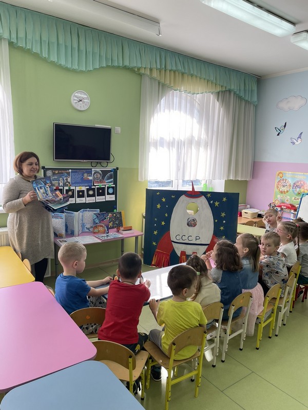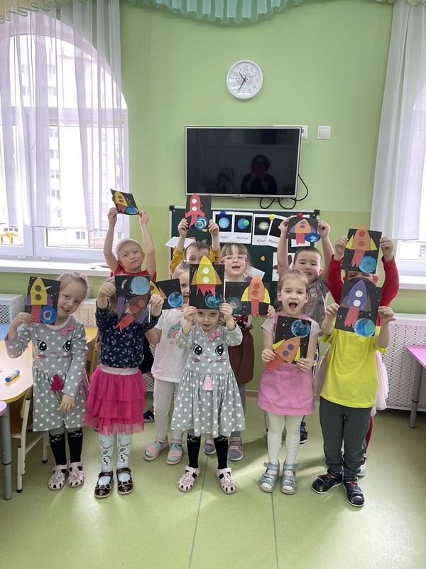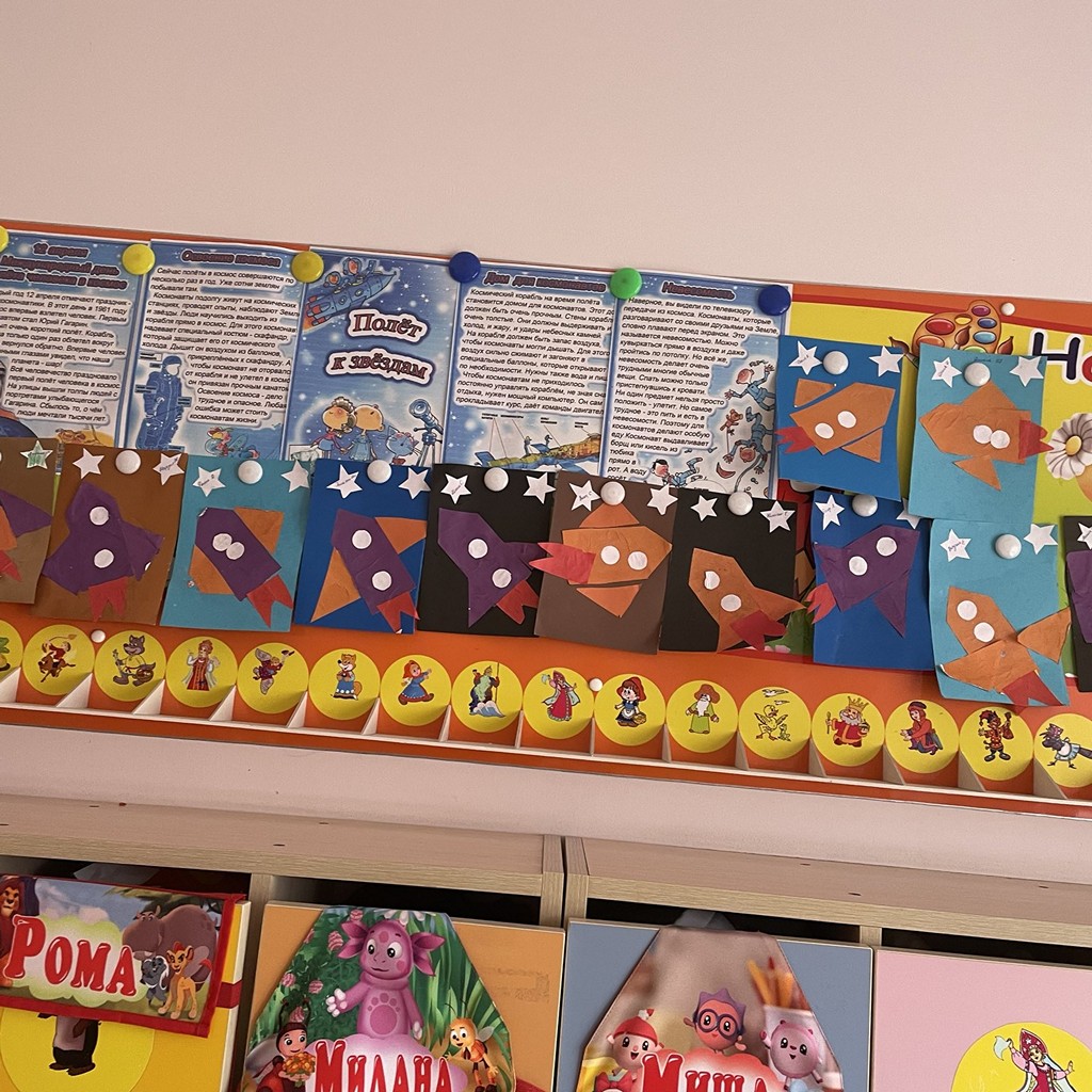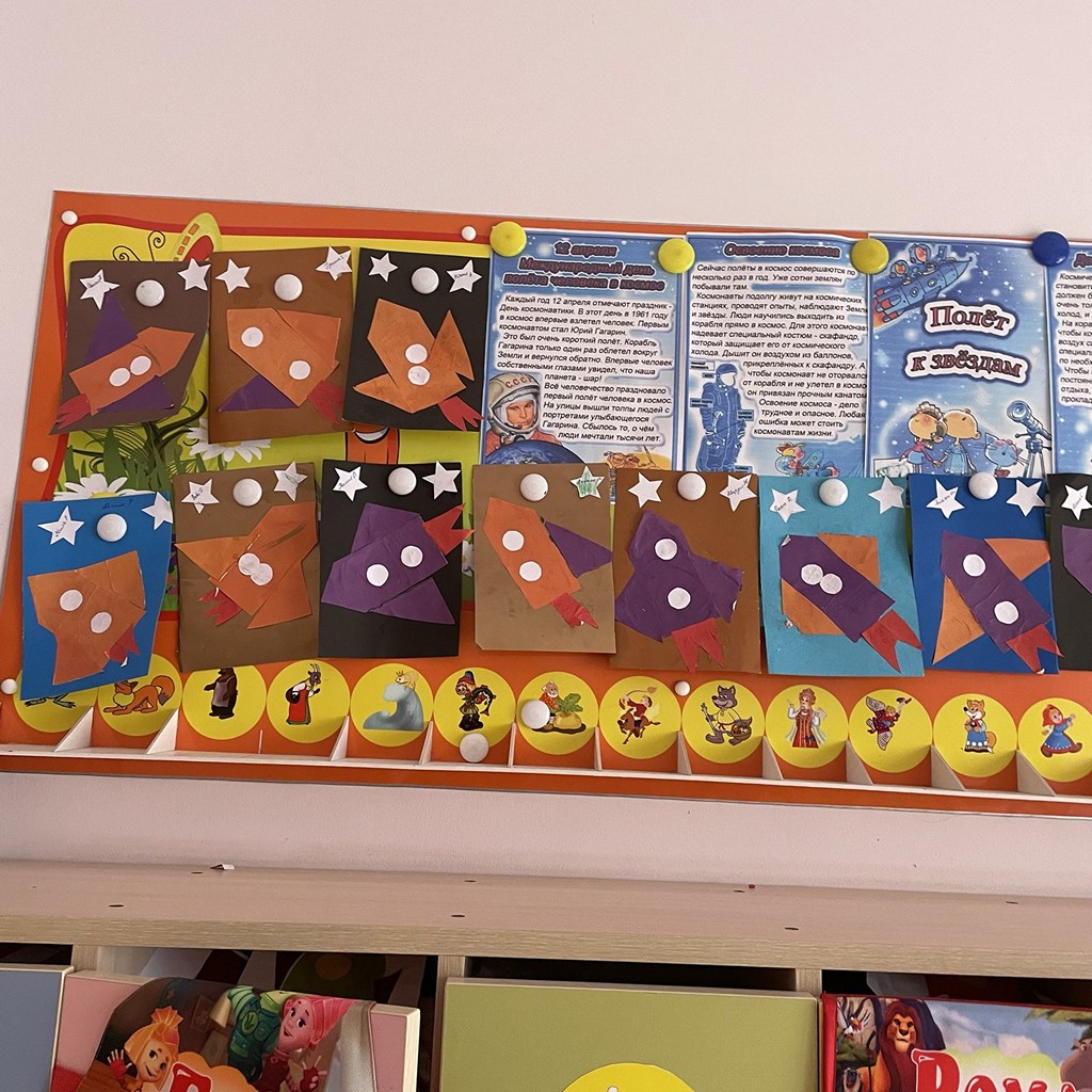 12 апреля в России, да во всем мире, отмечают день космонавтики. Этот праздник приурочен к первой дате полёта человека в космос. Педагоги и дети нашей группы подготовили стен газету «Космодром». Каждый ребёнок старался разукрасить свою ракету и подготовить ее к полёту в космос. Для выставки в группе «Неваляшки» дети подготовили: аппликацию «Ракета».