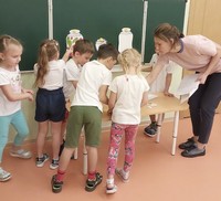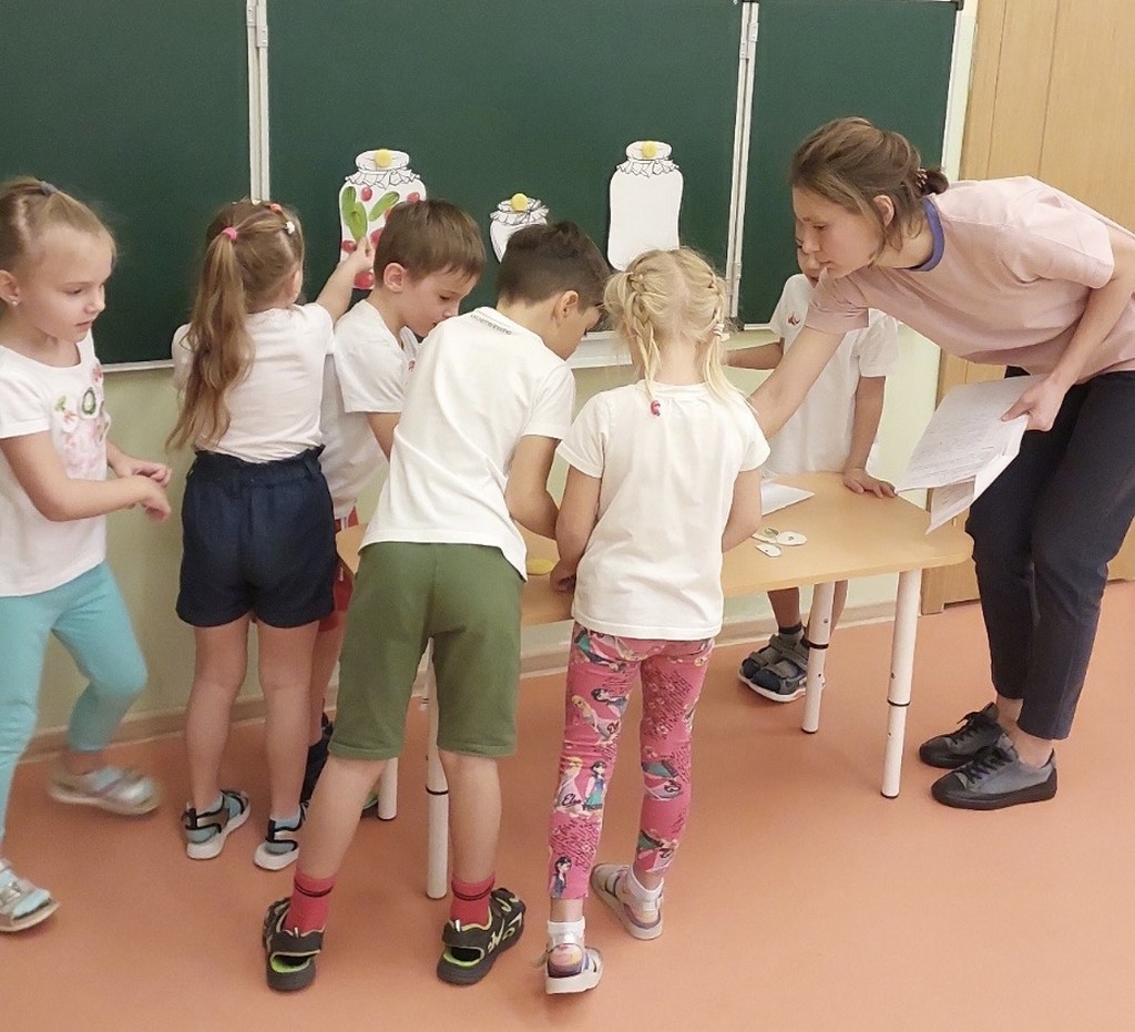 Используя для прохождения квеста карту, дети выполняли задания: отгадывали загадки о фруктах и овощах, играли в дидактическую игру «Четвёртый лишний» и делали заготовки на зиму, раскладывая в банки фрукты и овощи для засолки, компота и варенья.