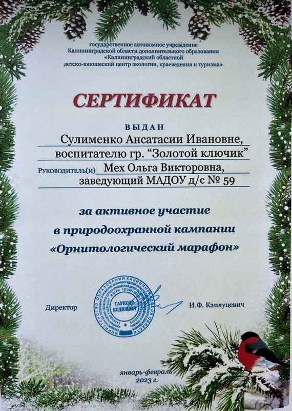 В рамках кампании дошкольники в совместном творчестве с родителями и на изобразительном занятии в группе при участии воспитателя Сулименко А. И. выполнили рисунки к выставке «Зимующие птицы Калининградской области».