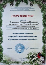 Семья Сусловой Вероники воспитанницы подготовительной к школе группы «Золотой ключик» выполнили кормушку и приняли участие в конкурсе в номинации «Классическая кормушка» из природного материала. По результатам областного конкурса Суслова Вероника получила Сертификат участника. Поздравляем!