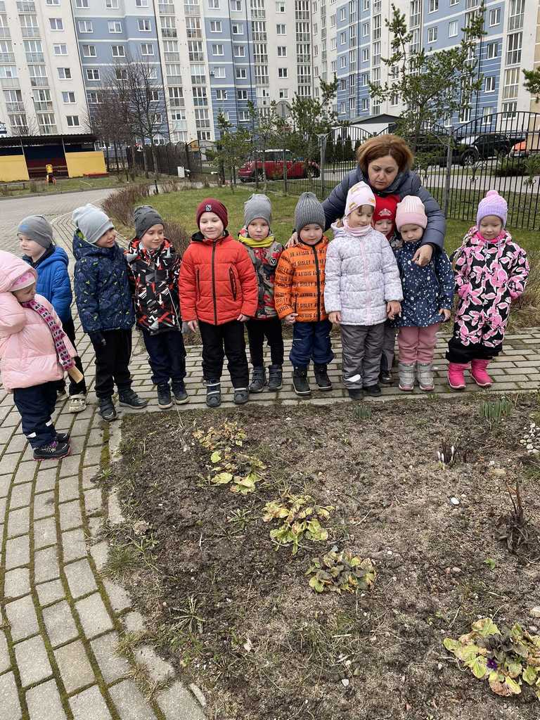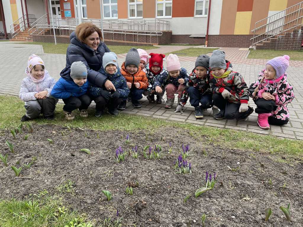 Во время прогулок дети любуются красотой Весны . Наблюдают за изменениями природы . Наш сад очень красивый, на территории много деревьев и кустарников. Дети заметили, что после того как растаял снег, появляются первые цветы : мать -и-мачеха и одуванчики . Весной на клумбе взошли первоцветы : крокусы с нежными белыми лепестками и крокусы с ярко -фиолетовыми лепестками . Вся земля покрывается зеленым ковром - травой .