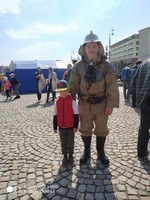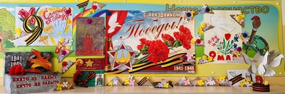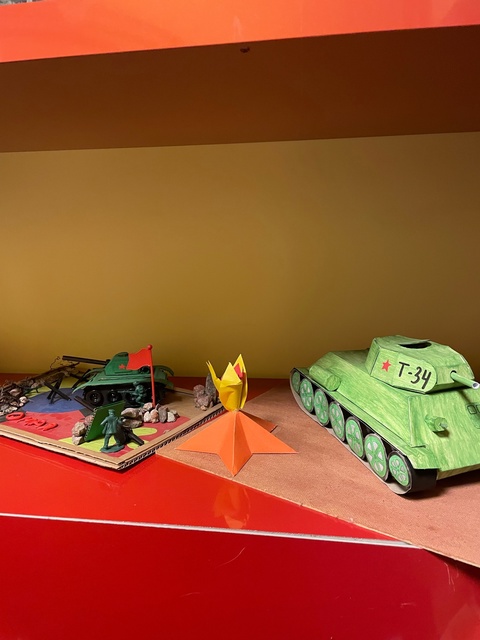 Макет легендарного советского танка Красной Армии – Т-34, плакаты к 9 мая с изображением голубя – символа мира, «георгиевской ленточки» - символа уважения и благодарности к ветеранам, в также дань памяти павшим на поле боя.
