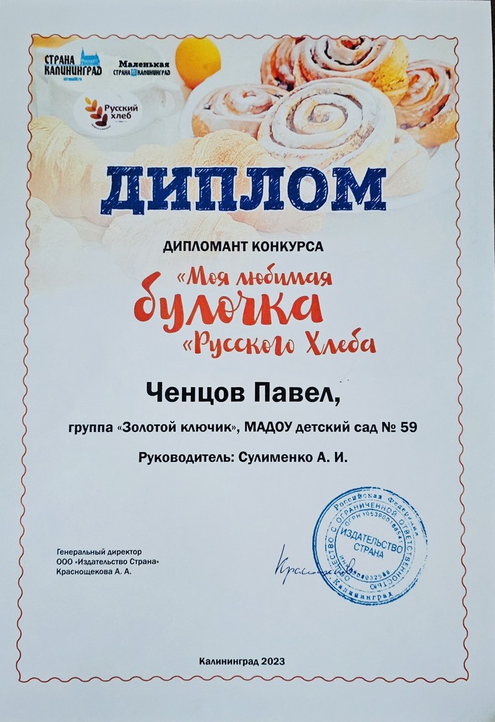 Газета «Страна Калининград» и журнал «Маленькая страна Калининград» вместе с компанией «Русский Хлеб» подготовили вкусный конкурс «Моя любимая булочка «Русского Хлеба». Воспитанник группы «Золотой ключик» Ченцов Павел стал призёром конкурса за весёлый и необычный рисунок булочки! Поздравляем Павла с победой!