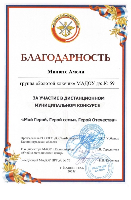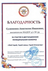 В ежегодном муниципальном конкурсе ко Дню Героев Отечества «Мой Герой, Герой Семьи, Герой Отечества» в номинации «И подвиг, и честь, и слава!» свой рисунок, в котором отражён геройский поступок представила воспитанница подготовительной к школе группы «Золотой ключик» Милюте Амели. Подвиг космонавта Юрия Гагарина, как первого человека, который совершил полёт в космос знает весь мир. Рисунок Амели отражает геройский поступок Юрия Гагарина и уже с детского сада ребята знают: имя первого космонавта - героя нашего Отечества!