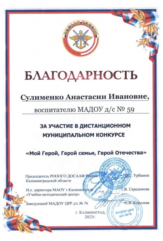По итогам Конкурса экоплаката «Чистая Балтика» получен наградной материал: Суслова Вероника награждена Грамотой участницы в возрастной категории от 3 до 7 лет и Сулименко А.И. - Благодарственным письмом за подготовку участников Международного конкурса экоплаката и вклад в экопросвещение молодого поколения. Поздравляем!