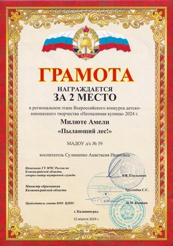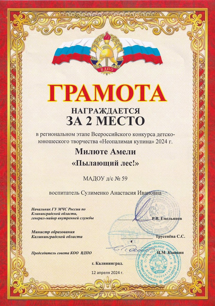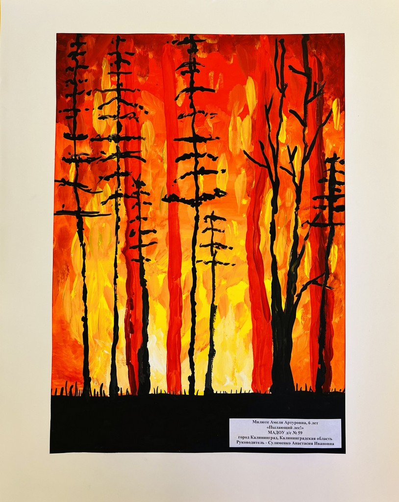 В конкурсе детско-юношеского творчества по пожарной безопасности «Неопалимая купина» 2024 г. в возрастной группе до 7 лет приняла участие воспитанница группы «Золотой ключик» МАДОУ д/с №59 Амели Милюте. В номинации художественно-изобразительное творчество с рисунком «Пылающий лес!» - награждена Грамотой за 2 место! Конкурс направлен на привитие сознательного и ответственного отношения к мерам пожарной безопасности и гражданско-патриотического воспитания детей.