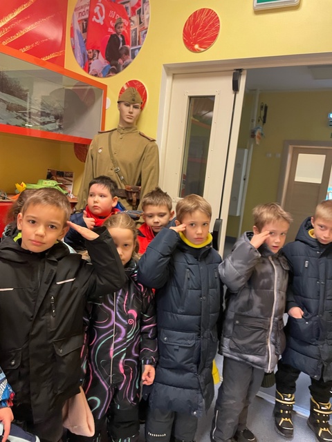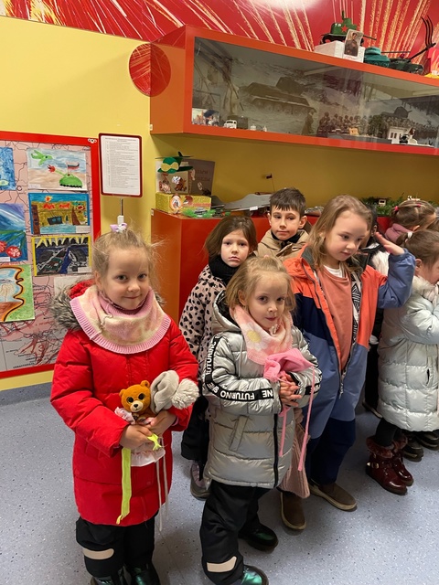 Девочки группы «Золотой Ключик» 20 февраля 2025 года от всей души поздравили с наступающим праздников мальчиков, подготовили для них поздравления и подарки, далее посетили музей «9 Мая», размещенный во втором корпусе детского сада.